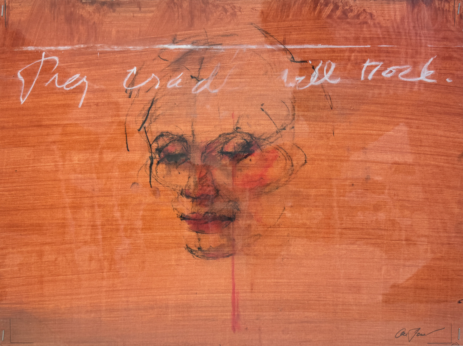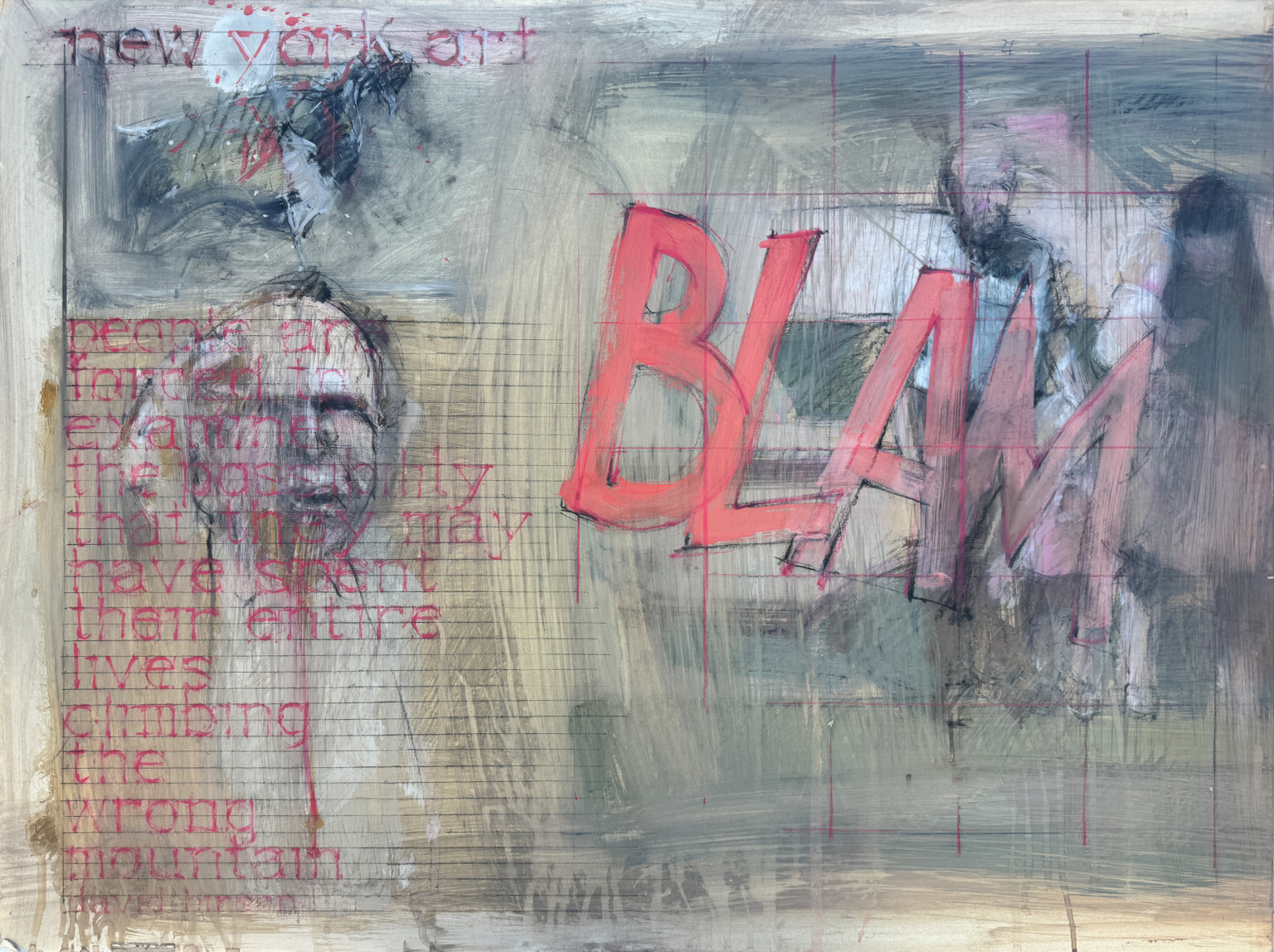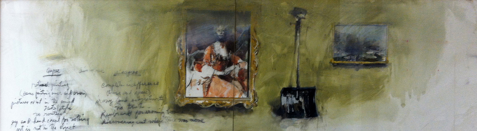 He was a prolific artist who worked mostly in gouache, pastel, charcoal and watercolor. His work evolved from traditional landscapes, portraits and figure drawings to expressive mixed media works that tend to look more like deconstructed paintings or large sketchbook studies, often containing hand-drawn text expressing his point of view on all kinds of subjects ranging from religion and politics to sports, music and human relationships. It is the artist’s later work – that which confronts the viewer with his opinions and perceptions – that makes up the exhibition, Piece of Mind.