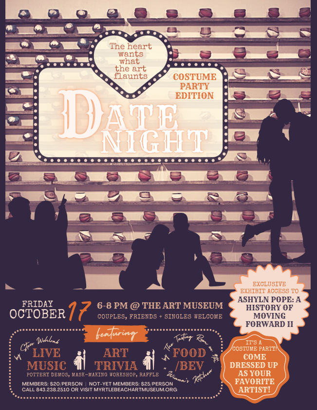 The Art Museum strives to raise the level of cultural dialogue along the Grand Strand through the presentation of fresh, adventurous and stimulating events. Our events are carefully planned to broaden interaction with and understanding of the arts, creativity and the world of ideas.
